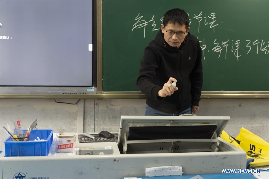 A teacher disinfects podium after an online class in No. 4 High School of Xiangyang in Xiangyang, central China's Hubei Province, April 10, 2020. As the epidemic prevention and control situation continues to improve, schools in Xiangyang have carried out a series of measures to prepare for reopening. The No. 4 High School of Xiangyang has begun to organize some teachers to enter the classroom to give students online lessons on the premise of doing a good job in campus epidemic containment. (Photo by Xie Jianfei/Xinhua)