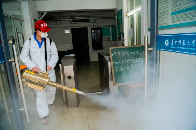 A staff member disinfects the dormitories at the Central China Normal University in Wuhan. (Photo/Chen Xichang)