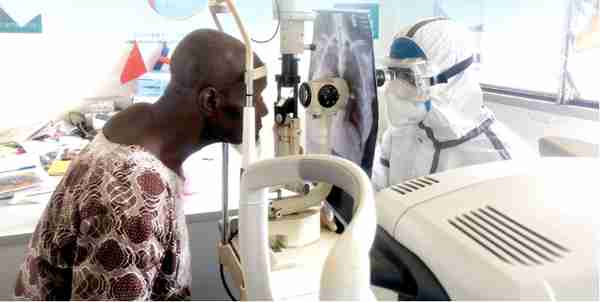 Head of the Chinese medical team to the Central African Republic has an eye examination for a local resident, April 7. Photo courtesy of the Chinese medical team to the Central African Republic