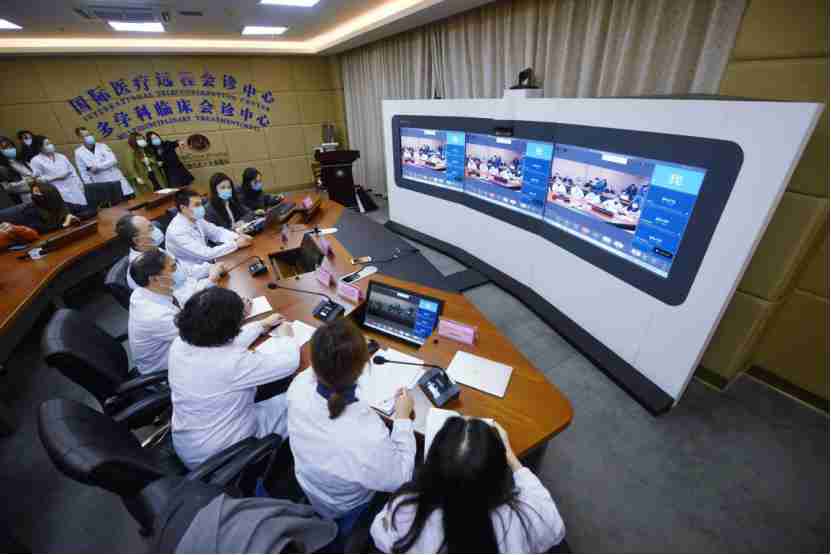 Chinese medical experts discuss treatment plans of COVID-19 with their Mexican counterparts during a video conference held at the international teleconsultation center of Hangzhou Red Cross Hospital, east China’s Zhejiang province, April 3, 2020. Long Wei/People’s Daily Online