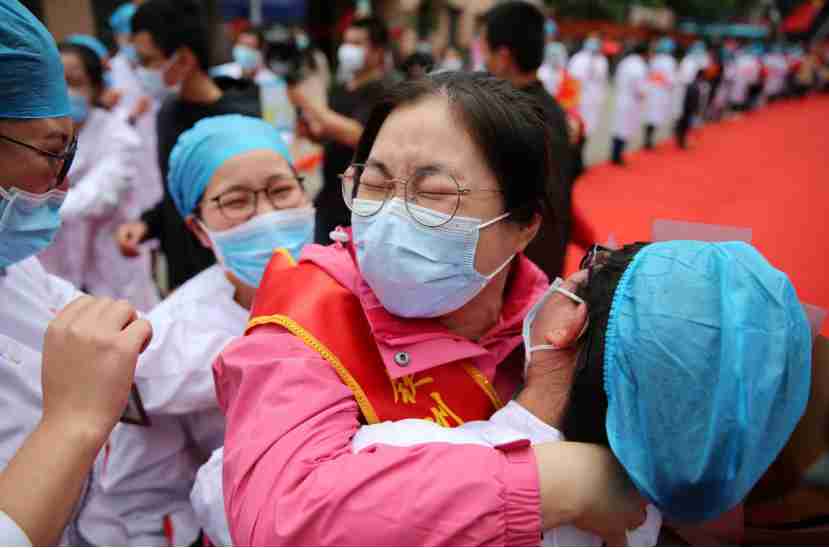 A medical worker dispatched to assist Hubei hugs her colleague after returning to the Second People’s Hospital in Qinzhou, Guangxi Zhuang Autonomous Region, April 14, 2020. Zeng Kaihong/People’s Daily Online