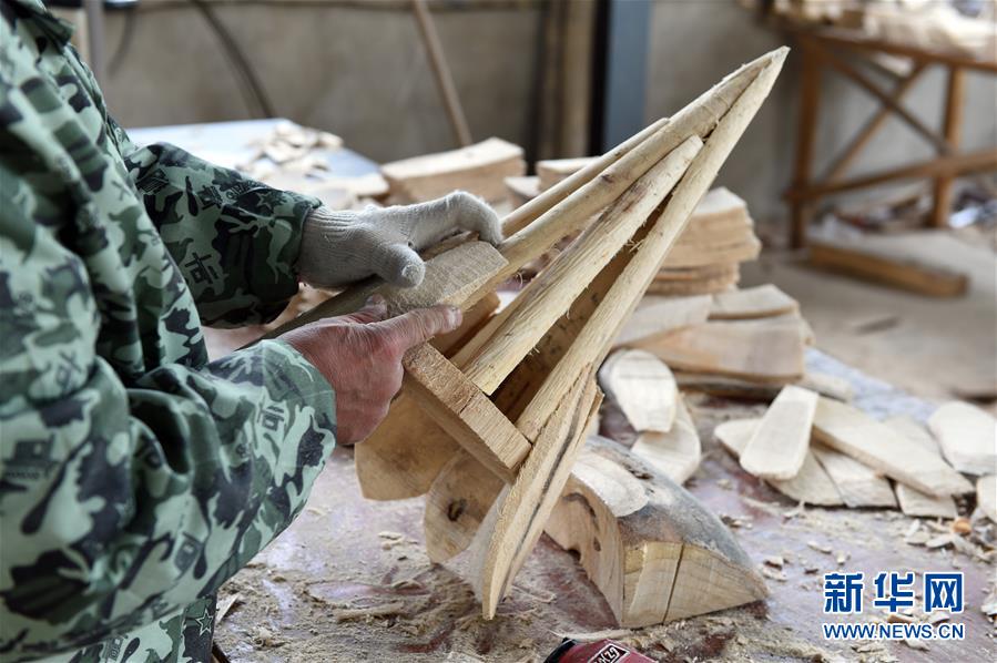 A local worker makes wooden handicrafts at a company in Wangnao village, Funan county on April 14. (Photo/Xinhua)