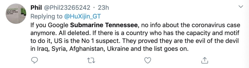 A Twitter user pointed out that no information about coronavirus on the USS Tennessee could be found on Google anymore. “All deleted. If there is a country who has the capacity and motif to do it, US is the No. 1 suspect,” the user noted.