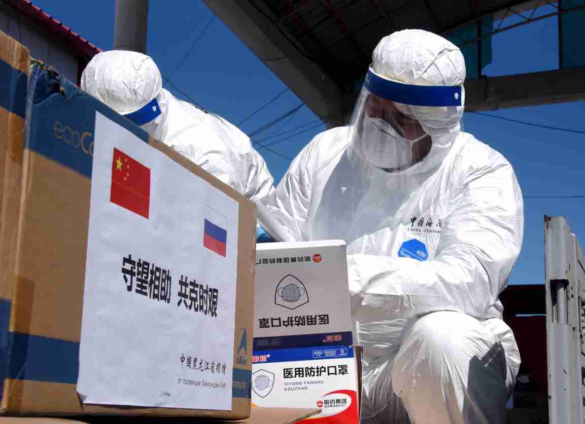 Customs staff check anti-pandemic materials donated by northeast China’s Heilongjiang Province to Russia in Heihe, Heilongjiang Province, April 2, 2020. Qiu Qilong/People’s Daily Online