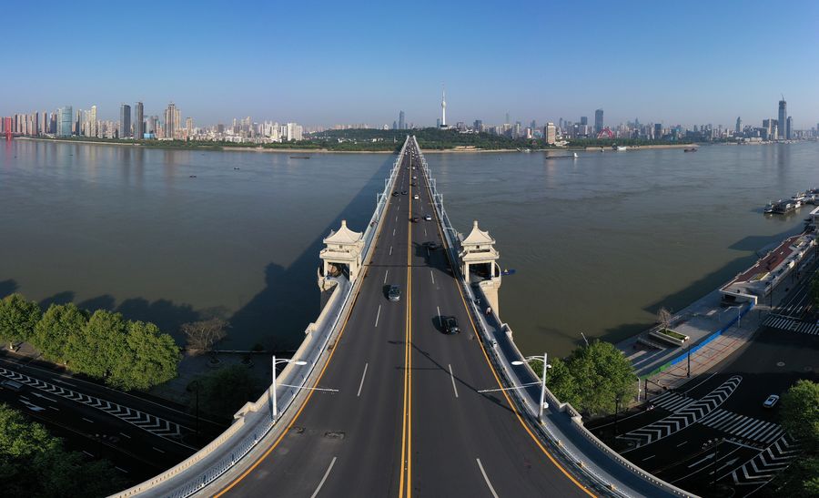 Aerial photo shows the Yangtze River bridge during the morning rush hour in Wuhan, central China's Hubei Province, April 15, 2020. (Xinhua/Li He)