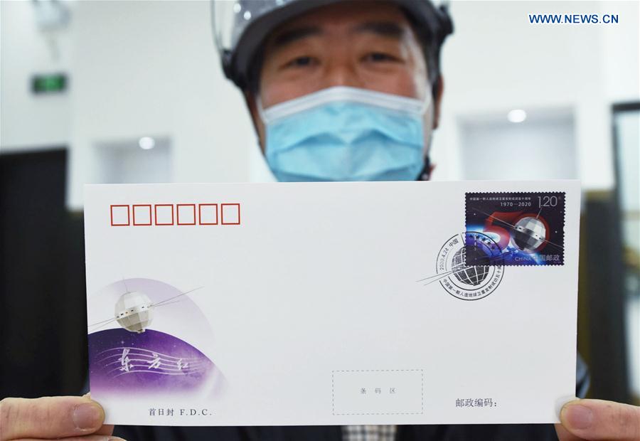 A stamp collector shows a First Day Cover (FDC) marking the 50th anniversary of the successful launch of Dongfanghong-1, China's first man-made satellite, in Hangzhou, east China's Zhejiang Province, April 24, 2020. China Post issued a set of commemorative stamps on Friday, which is also the fifth Space Day of China. (Photo by Long Wei/Xinhua)
