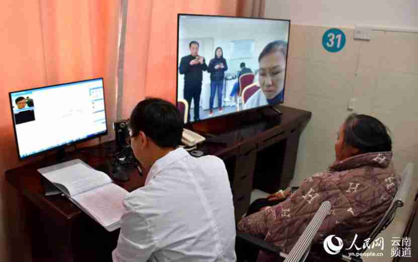 Photo taken last November shows medical experts in Yunnan’s capital city of Kunming conducting a consultation for a patient in Baduo village via a telemedicine system. (Photo by Cheng Hao/People’s Daily Online)