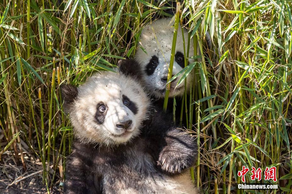 Panda twins Meng Yuan (front) and Meng Xiang (rear) play at the Berlin Zoo. Photo courtesy of the Berlin Zoo