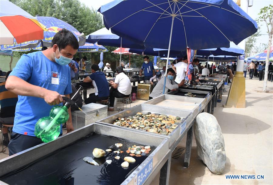 A merchant sprays water on the jades at Hotan jade trading market in Hotan Prefecture, northwest China's Xinjiang Uygur Autonomous Region, May 16, 2020. The market has reopened recently under COVID-19 prevention and control measures. (Xinhua/Sadat)