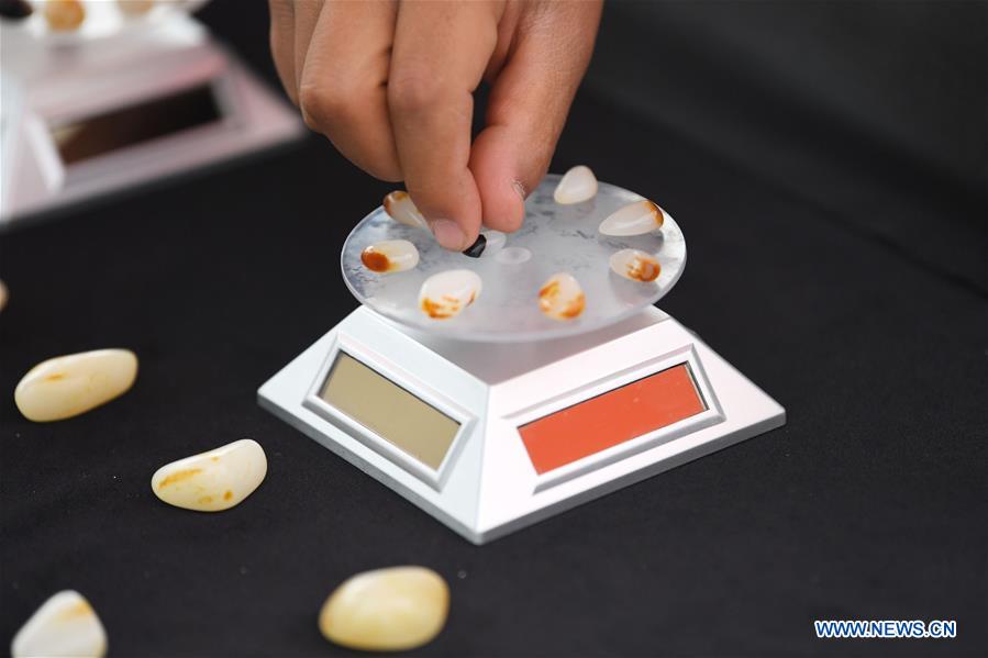 A merchant displays Hotan jades at Hotan jade trading market in Hotan Prefecture, northwest China's Xinjiang Uygur Autonomous Region, May 16, 2020. The market has reopened recently under COVID-19 prevention and control measures. (Xinhua/Sadat)