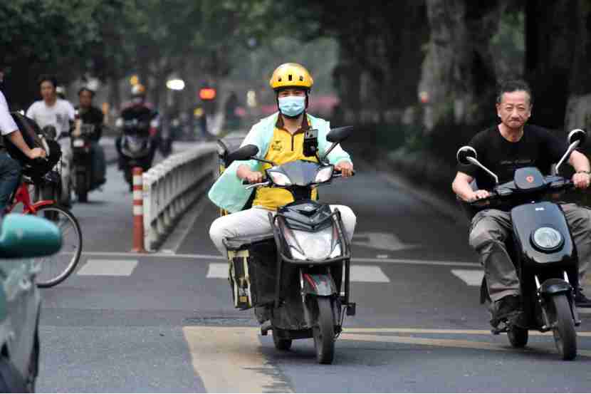 A courier is on his way delivering meals, May 4. Photo by Pan Haisong/People’s Daily Online
