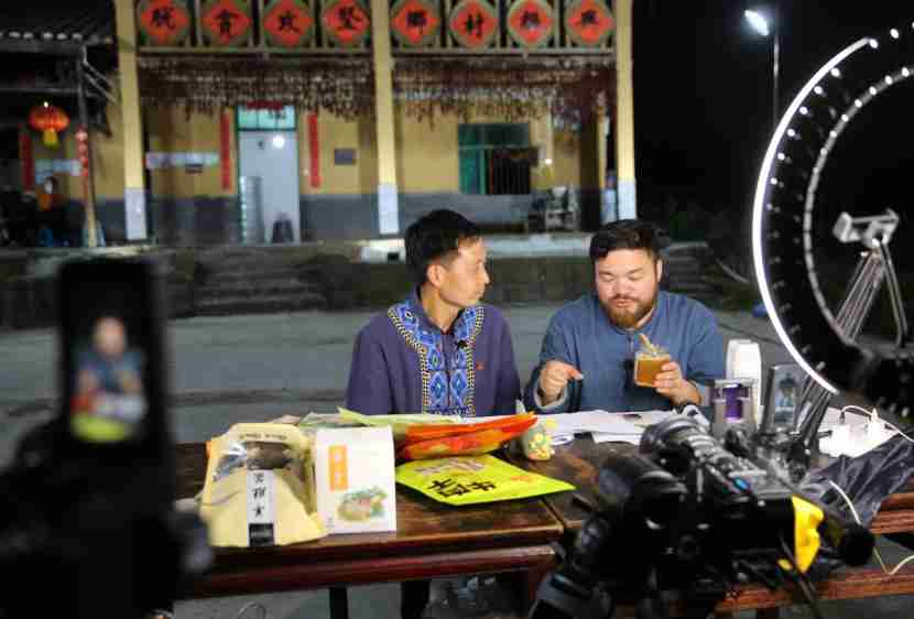 An official of Huaxi village, Zhongyi township, Shizhu county of Chongqing municipality introduces local delicacy through live streaming, together with Huzige, an online influencer, April 15. Photo by Liang Zhiqiang/People’s Daily Online