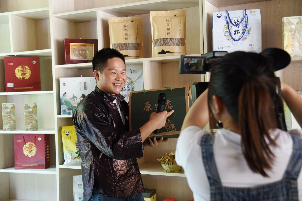 Liao Chaocheng, an official stationed at Jiayi village, Jihua township, Rongjiang county, Guizhou province makes a video to promote local specialties on May 8. Photo by Liu Jinyin/People’s Daily Online