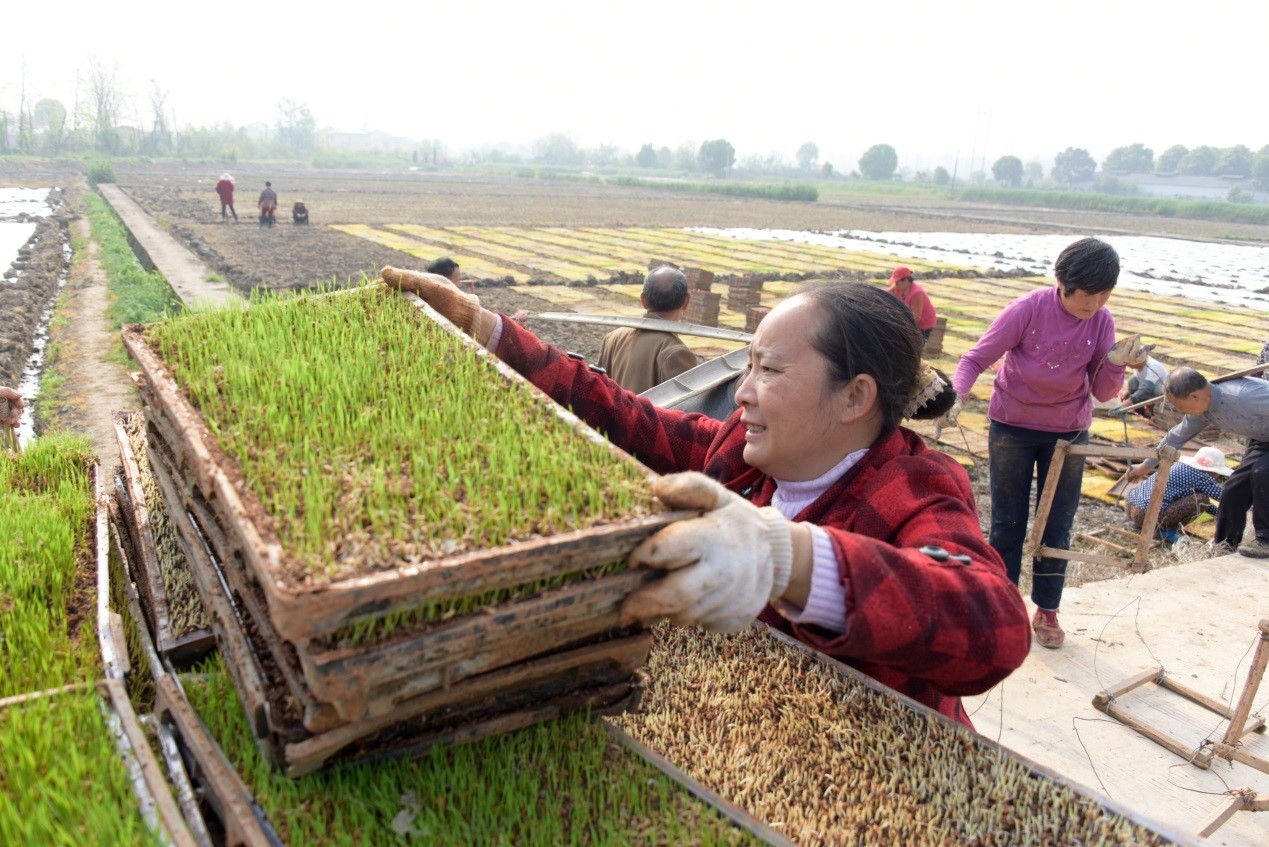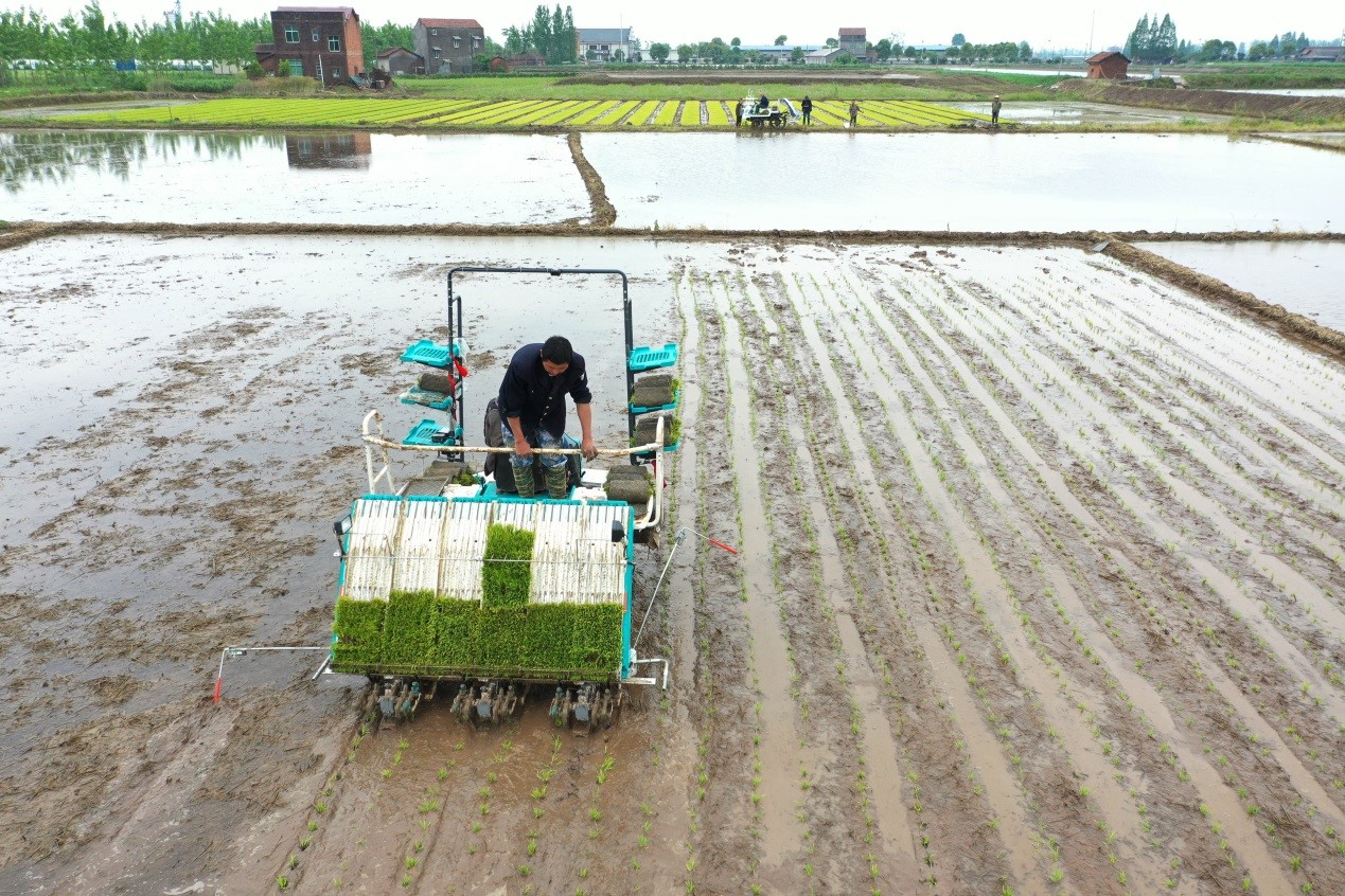 A farmer transplants early rice with a rice transplanter in Renhe village, Xiaodukou town, Lixian county, Hunan province on April 22. Photo by Bai Yipu/ People’s Daily Online