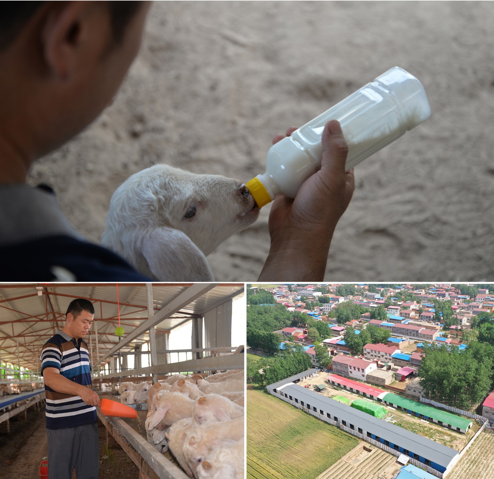 The upper part of this combo photo taken on May 16, 2020 shows 34-year-old Ding Yijun from Gangliu village, Daqiao township, Weishi county of Kaifeng, central China’s Henan province feeding a lamb milk. The lower part of this combo photo taken on the same day shows Ding’s sheep farm, which covers an area of about 0.53 hectares in the village, and with over 800 sheep (R).