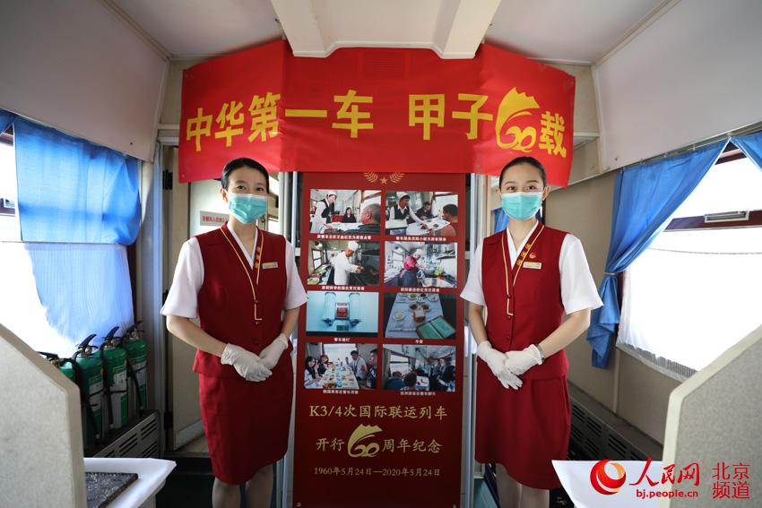 Two attendants stand in front of a poster marking the 60th anniversary of the K3/4 train. (Photo/Yin Xingyun)