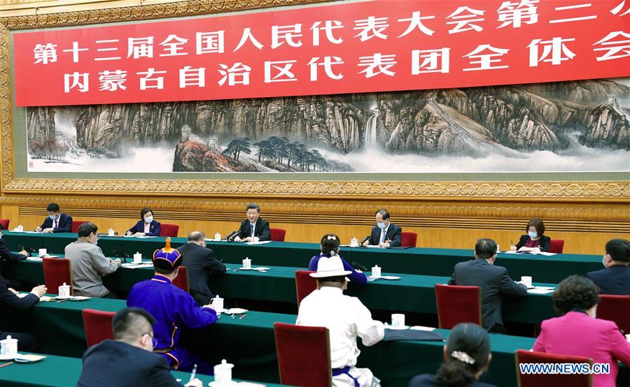 Chinese President Xi Jinping, also general secretary of the Communist Party of China Central Committee and chairman of the Central Military Commission, takes part in a deliberation with his fellow deputies from the delegation of Inner Mongolia Autonomous Region at the third session of the 13th National People's Congress (NPC) in Beijing, capital of China, May 22, 2020. (Xinhua/Xie Huanchi)