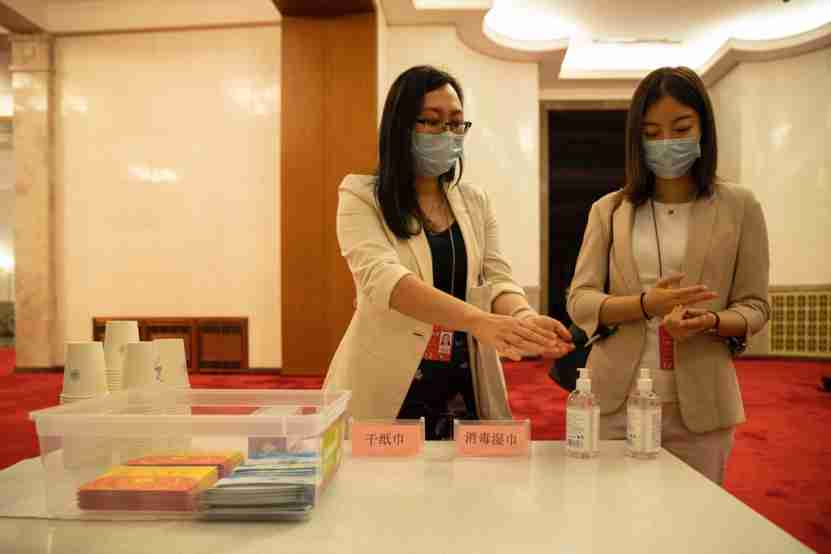 Disinfectant and hand sanitizer are offered to meeting attendees outside the press room on May 20. Photo by Zhang Wujin/People’s Daily