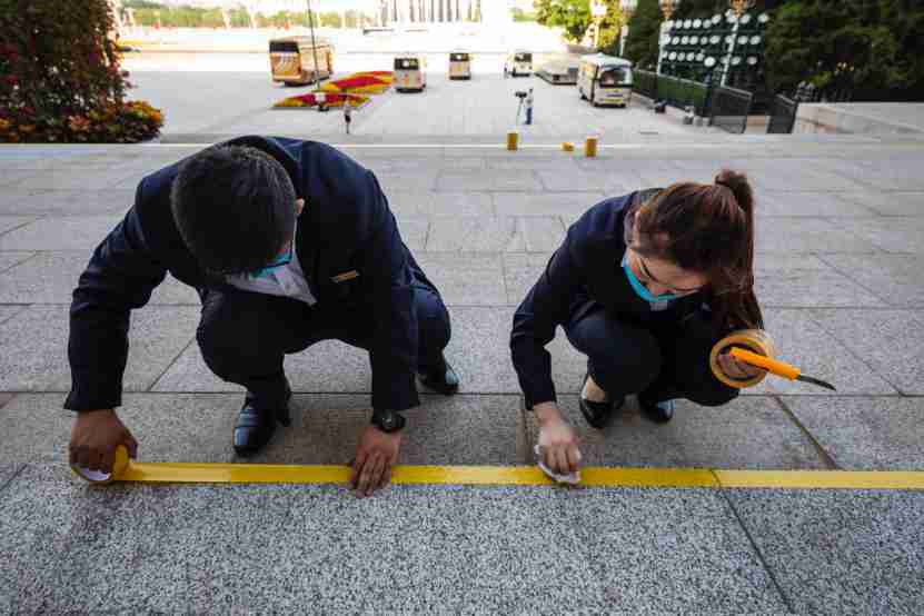 Staff members paste yellow tapes outside the Great Hall of the People on May 20, before “two sessions” kick off. Photo by Zhang Wujin/People’s Daily