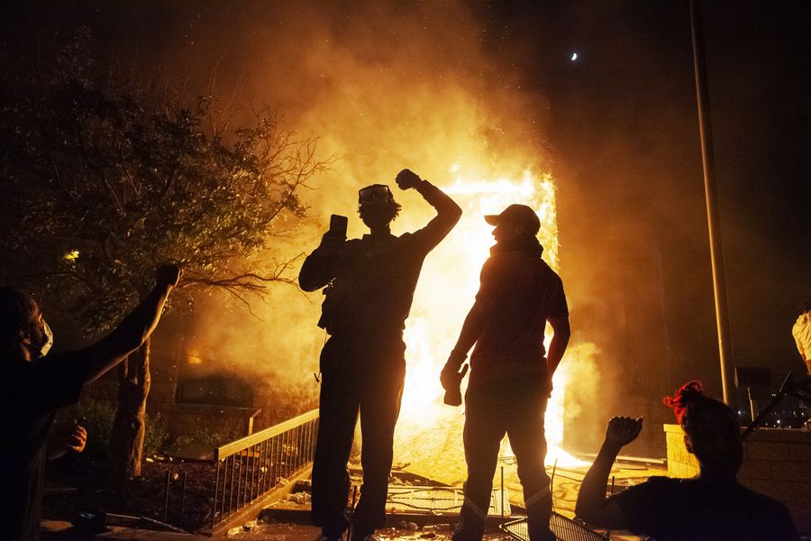 Protesters stand in front of the burning Minneapolis 3rd Police Precinct building in Minneapolis, Minnesota, the United States, on May 28, 2020. (Photo by Ben Hovland/Xinhua)