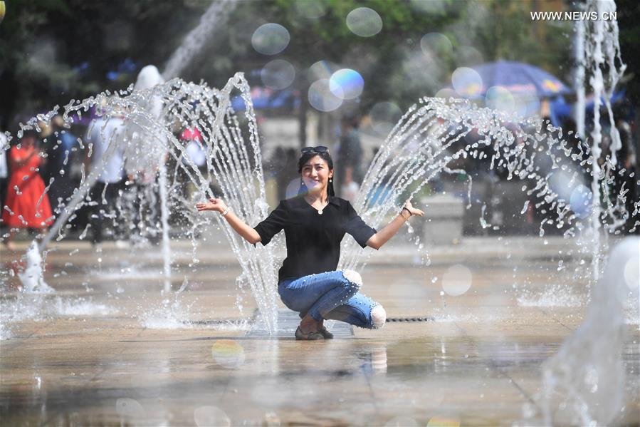 A girl relaxes at a fountain square in Hotan City, northwest China's Xinjiang Uygur Autonomous Region, May 27, 2020. Located to the south of the Taklimakan Desert, Hotan City has taken on a new look as the living environment is improved a lot with the modernization of infrastructure. (Xinhua/Sadat)