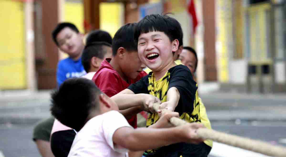 Children take part in a tug-of-war on Saturday in Congjiang county, Guizhou province, to mark International Children's Day, which falls on Monday. [Photo by Luo Jinglai/For China Daily]