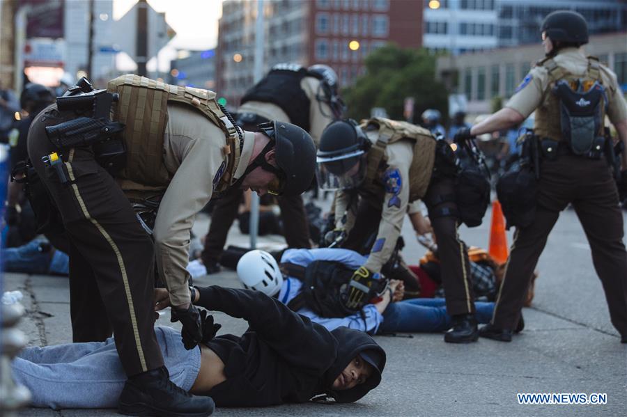 Demonstrators are arrested during a protest against the death of George Floyd in Minneapolis, the United States, May 31, 2020. (Photo by Angus Alexander/Xinhua)
