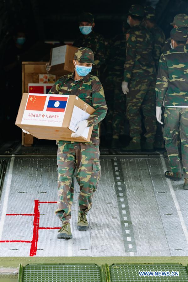 Lao soldiers unload medical supplies from the Chinese air force aircraft in Lao capital Vientiane on June 2, 2020. The second batch of medical supplies, provided by China's Ministry of National Defense to its Lao counterpart for the fight against COVID-19, was handed over in Vientiane on Tuesday. (Chinese Embassy in Laos/Handout via Xinhua)