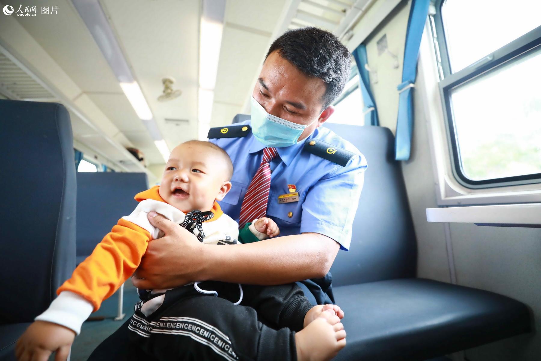 A staff member on Train No. 5633 with a child on May 21. (Photo/Li Kai)