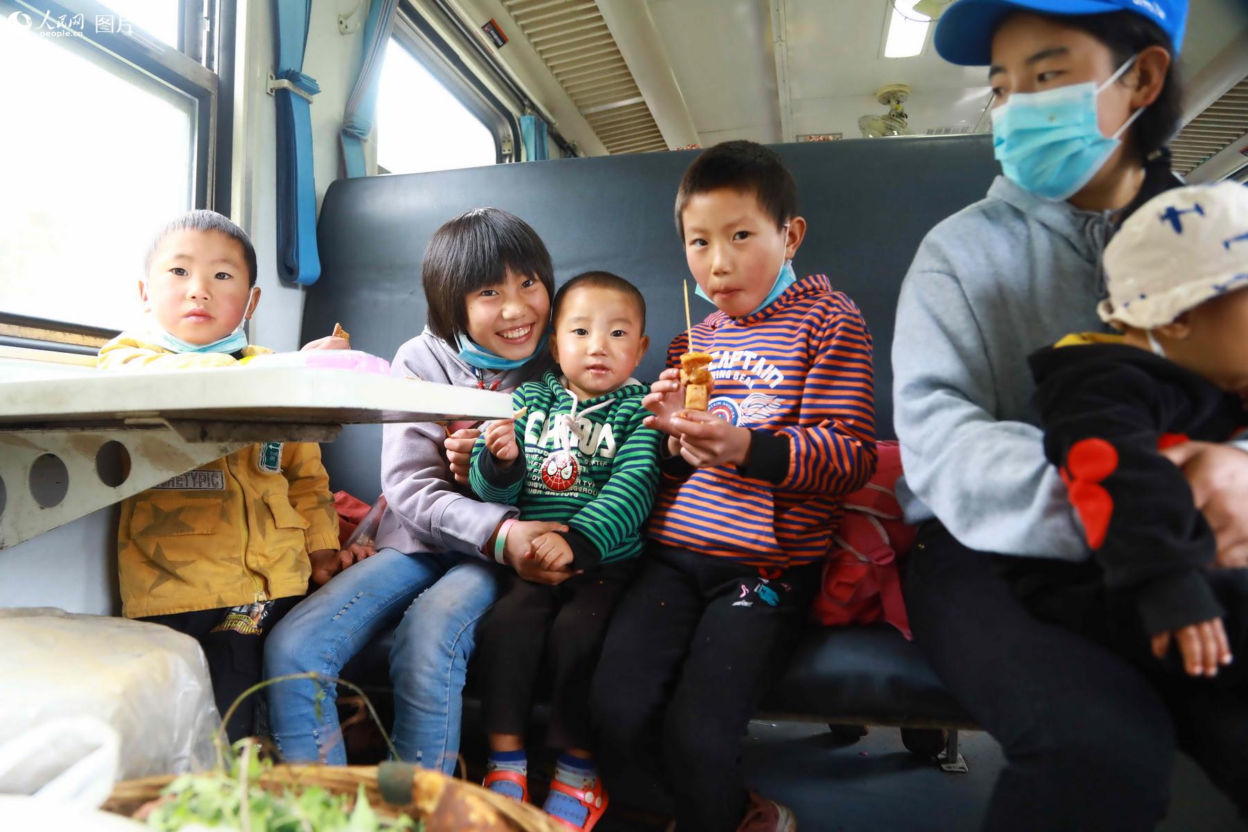 A group of Yi children take Train No. 5633 on May 17. (Photo/Li Kai)