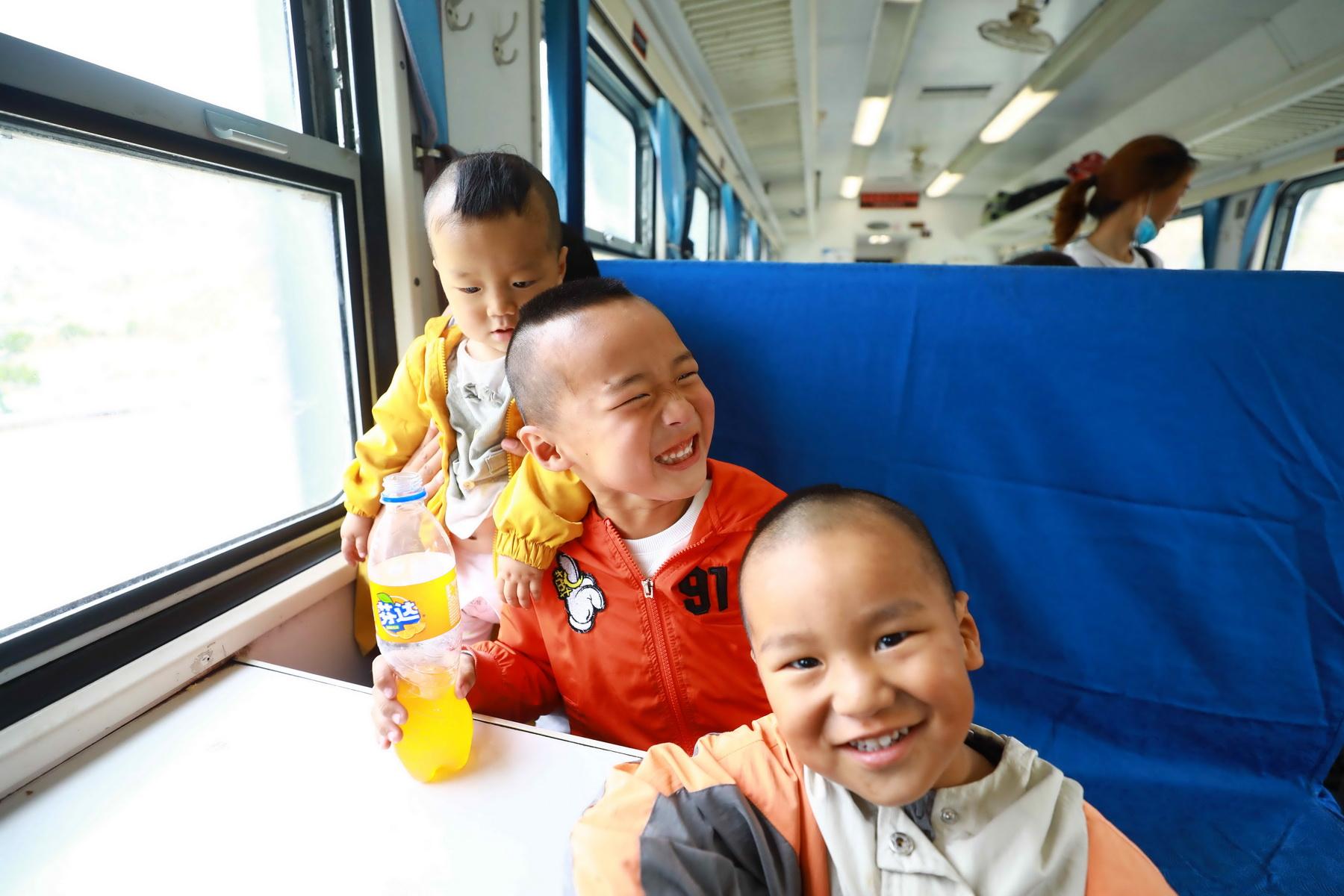 Three children of the Yi nationality on Train No. 5633 on May 21. (Photo/Li Kai)