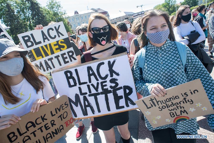 People take part in a protest over the death of George Floyd in Vilnius, Lithuania, on June 5, 2020. Hundreds of people on Friday joined a march in Vilnius, capital of Lithuania, to show their solidarity with George Floyd, an unarmed black man suffocated to death by a white police officer in the mid-western U.S. state of Minnesota last week. (Photo by Alfredas Pliadis/Xinhua)