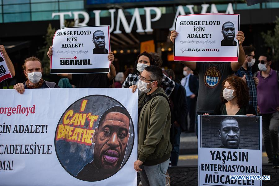 People take part in a protest against the killing of George Floyd in Istanbul, Turkey, June 5, 2020. Turkish people on Friday staged a protest in Istanbul against the killing of an unarmed black man in the United States last week. (Photo by Yasin Akgul/Xinhua)