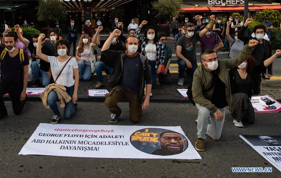 People take part in a protest against the killing of George Floyd in Istanbul, Turkey, June 5, 2020. Turkish people on Friday staged a protest in Istanbul against the killing of an unarmed black man in the United States last week. (Photo by Yasin Akgul/Xinhua)