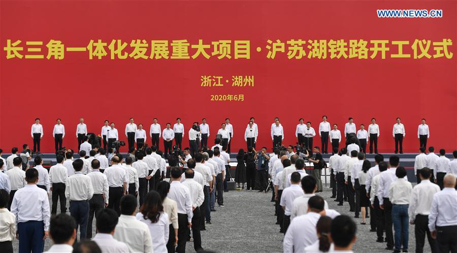 Photo taken on June 5, 2020 shows the launching ceremony of the construction of the Shanghai-Suzhou-Huzhou high-speed railway in Huzhou, east China's Zhejiang Province. Construction on a new high-speed railway linking Shanghai and the neighboring cities of Suzhou and Huzhou was launched on Friday. The railway, with a designed top speed of 350 km per hour, is a key project for the Yangtze River Delta to further boost regional integration. (Xinhua/Huang Zongzhi)