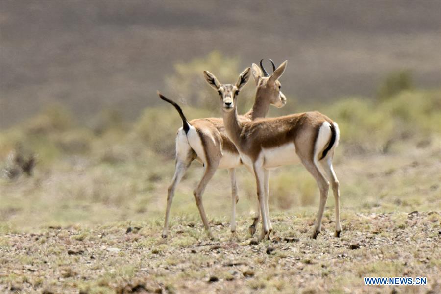 Goitered gazelles are seen at the Kalamayli Nature Reserve, northwest China's Xinjiang Uygur Autonomous Region, June 6, 2020. (Xinhua/Ding Lei)