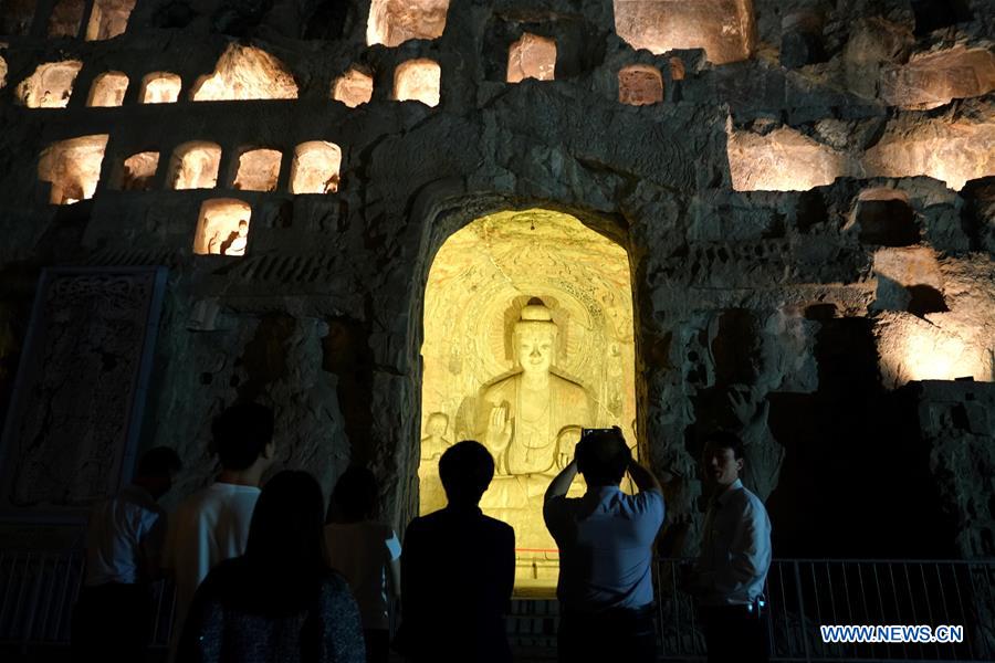 Tourists take part in a night tour at the Longmen Grottoes scenic area in Luoyang, central China's Henan Province, June 8, 2020. The Longmen Grottoes scenic area has introduced night tour programs since April 10 to meet tourist needs. Tourists can visit some of the finest Chinese Buddhist art here. (Xinhua/Li An)