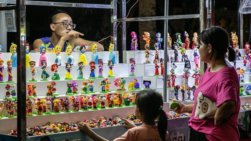 Customers visit a toy booth at a night market near Hainan University in Haikou, south China's Hainan Province, June 1, 2020. (Photo/Xinhua)