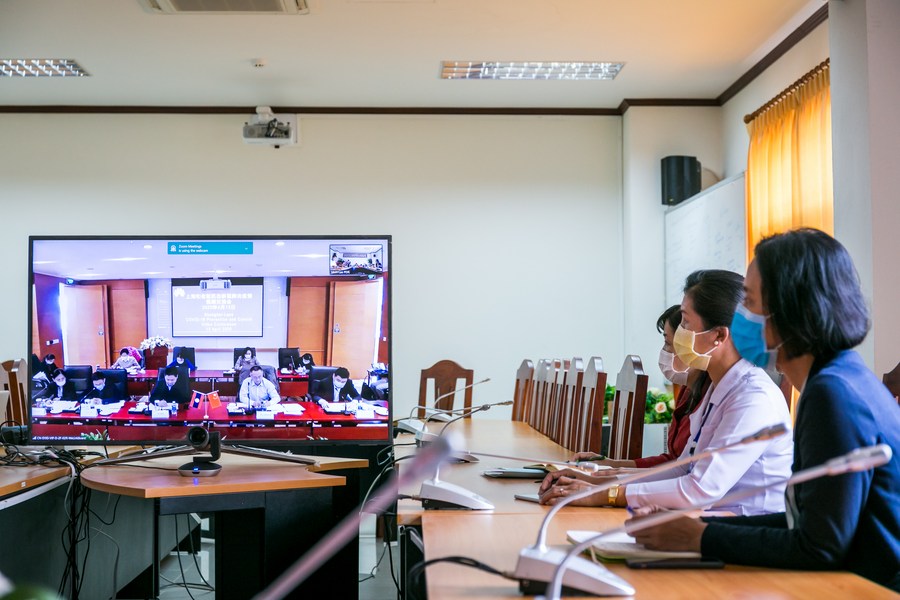 Representatives from Lao Ministry of Health and designated hospitals attend a video conference on COVID-19 prevention and control with medical experts from China's Shanghai in Vientiane, Laos, April 13, 2020. (Photo by Kaikeo Saiyasane/Xinhua)