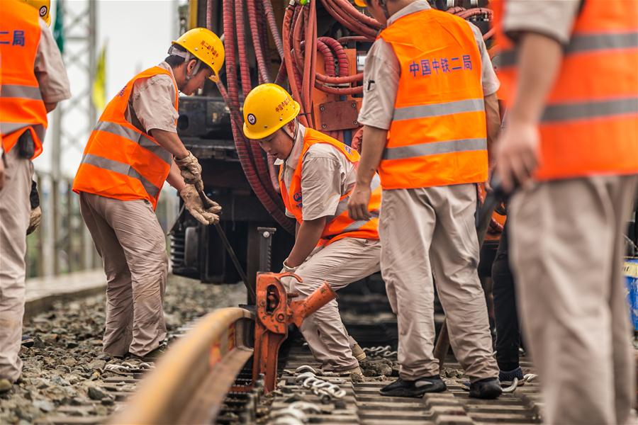 Workers from China Railway No.2 Engineering Group (CREC-2) fix the welded seamless rails of the China-Laos railway in the northern suburb of Vientiane, Laos, on June 18, 2020. The CREC-2 has welded the first seamless rails for the China-Laos railway in the northern suburb of Lao capital Vientiane on Thursday morning. The seamless rail, also known as continuous welded rail (CWR) which eliminates rail joints, can improve the duration of steel rails, reduce the maintenance costs of locomotives and tracks, improve the stability and speed of trains, and enhance travel comfort. The China-Laos Railway is a project of the China-proposed Belt and Road Initiative, with a joint effort, aiming to convert Laos from a landlocked country to a land-linked hub. The project started in December 2016 and is scheduled to be completed and open to traffic in December 2021. (Photo by Kaikeo Saiyasane/Xinhua)