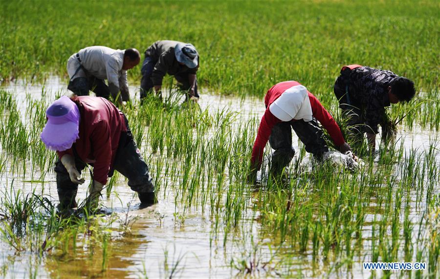 Farmers weed at a rice field in Arda Village in Fuhai County, northwest China's Xinjiang Uygur Autonomous Region, June 19, 2020. Fuhai introduced high-quality rice varieties for trial planting in order to find a way to cultivate rice in cold and high-altitude environments. (Xinhua/Sadat)