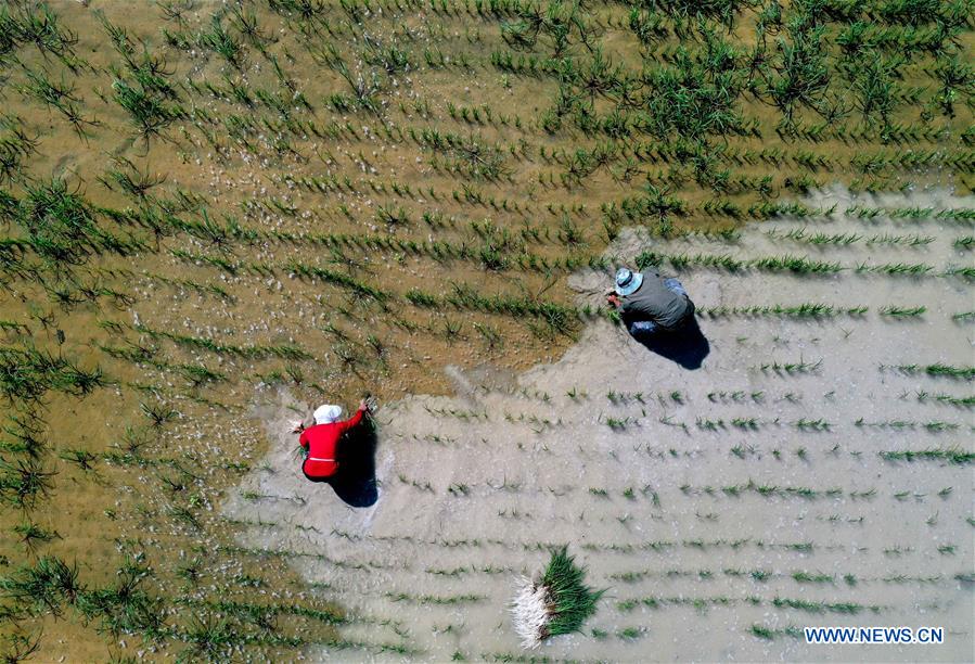 Aerial photo taken on June 19, 2020 shows farmers weeding at a rice field in Arda Village in Fuhai County, northwest China's Xinjiang Uygur Autonomous Region. Fuhai introduced high-quality rice varieties for trial planting in order to find a way to cultivate rice in cold and high-altitude environments. (Xinhua/Sadat)
