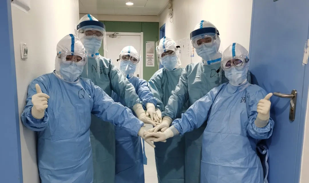 Members of a medical team from Peking University People's Hospital pose for group photos before going into the COVID-19 ICU ward in Wuhan. (Photo by Peking University People's Hospital)