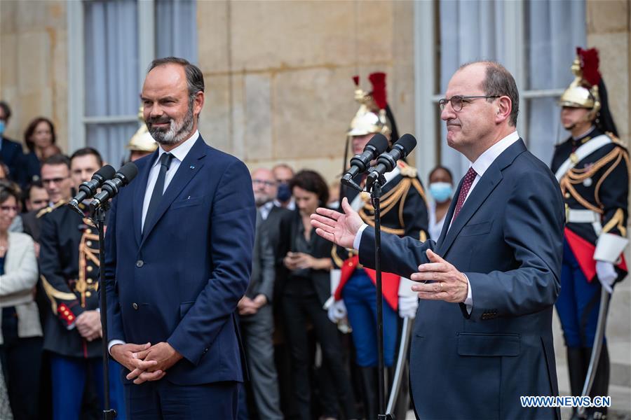 Edouard Philippe (L) and Jean Castex attend the handover ceremony in the courtyard of the Hotel Matignon in Paris, France, on July 3, 2020. Jean Castex, a 55-year-old top civil servant not known to the French general public, was appointed new prime minister by President Emmanuel Macron to replace Edouard Philippe, the French presidential palace announced on Friday. (Photo by Aurelien Morissard/Xinhua)