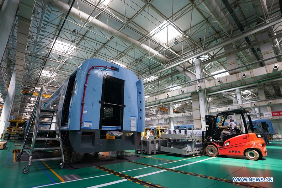 A technician works on a high-speed trains production line of CRRC Tangshan Co., Ltd. in Tangshan City in north China's Hebei Province, July 16, 2020. The production capacity of this company has recovered from the effect of COVID-19 with the help of local governments to fulfil the orders from home and abroad. (Xinhua/Xing Guangli)