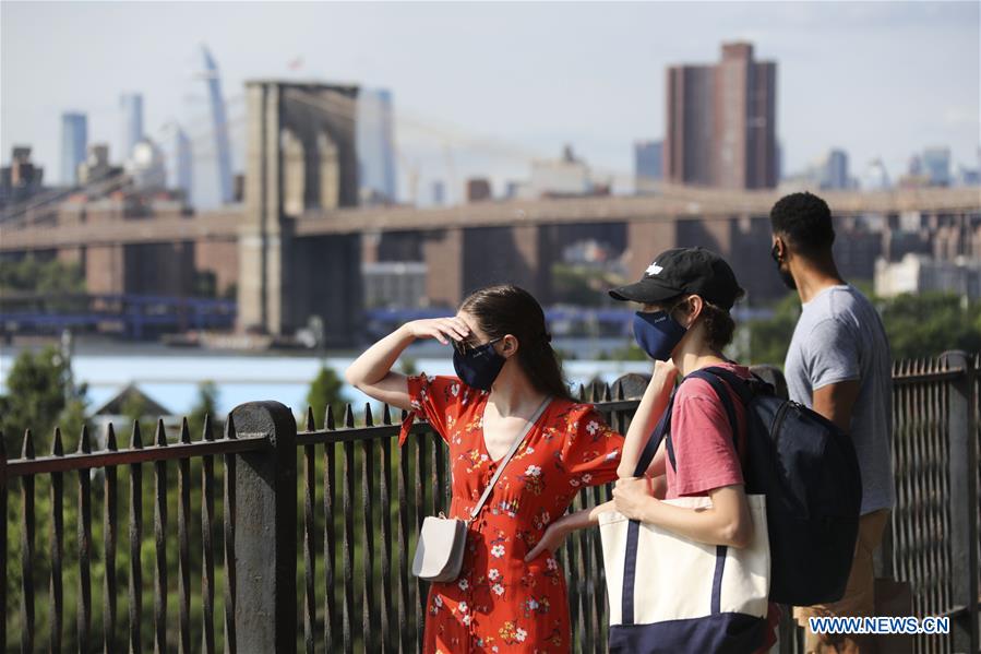 People are seen in a park in Brooklyn Borough of New York, the United States, on July 16, 2020. Confirmed COVID-19 cases topped 3.5 million on Thursday in the United States, with deaths over 137,000, while debate over mask-wearing, one of the most effective means of curbing the virus spread, persists around the country. (Xinhua/Wang Ying)