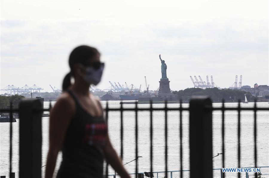 A woman walks in a park in Brooklyn Borough of New York, the United States, on July 16, 2020. Confirmed COVID-19 cases topped 3.5 million on Thursday in the United States, with deaths over 137,000, while debate over mask-wearing, one of the most effective means of curbing the virus spread, persists around the country. (Xinhua/Wang Ying)
