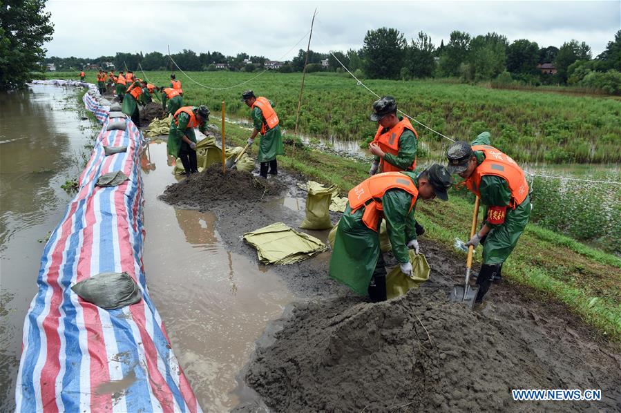 Armed police officers fill up sandbags to reinforce the Sanlongwei section of the levee in Baimao Town of Wuhu, east China's Anhui Province, July 16, 2020. A total of 120 armed police officers have been dispatched to help reinforce the Sanlongwei section of the levee as the water level in Yangtze River rised in Baimao due to days of heavy rainfalls. (Xinhua/Zhou Mu)