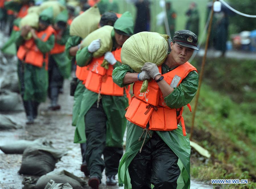 Armed police officers carry sandbags to reinforce the Sanlongwei section of the levee in Baimao Town of Wuhu, east China's Anhui Province, July 16, 2020. A total of 120 armed police officers have been dispatched to help reinforce the Sanlongwei section of the levee as the water level in Yangtze River rised in Baimao due to days of heavy rainfalls. (Xinhua/Zhou Mu)