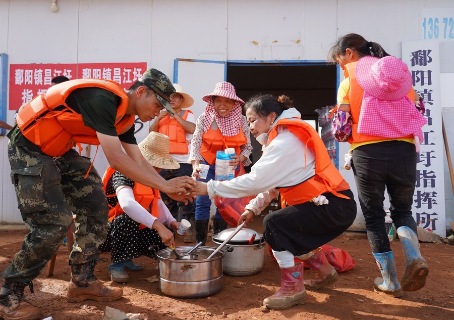 Yu Fengying (2nd R), leader of the woman volunteers, serves mung bean soup for an armed policeman in Jiangjialing Village, Poyang Town of east China's Jiangxi Province, July 11, 2020. (Xinhua/Zhang Haobo)